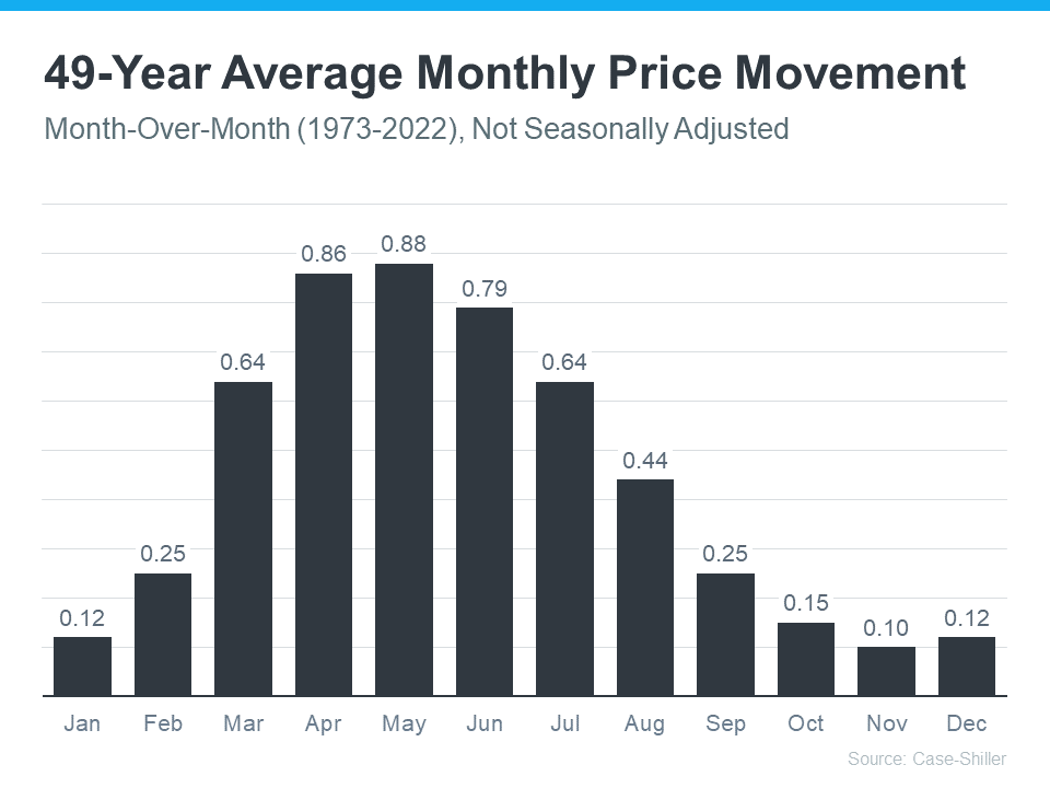 Home prices follow along with seasonality because prices appreciate most when something is in high demand. That’s why there’s a reliable long-term home price trend. The graph below uses data from Case-Shiller to show the typical percent change for monthly home price movement from 1973 through 2022 (not adjusted, so you can see the seasonality):