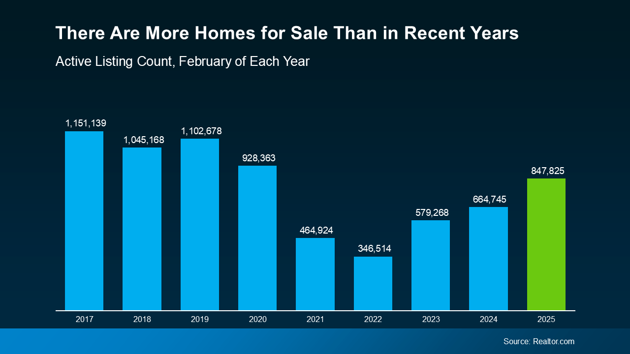 The number of homes for sale this February was higher than it’s been in any of the past five Februarys – and that’s great news for your home search. The graph below uses the latest data from Realtor.com to show that the supply of homes on the market has grown by 27.5% in just the last year: