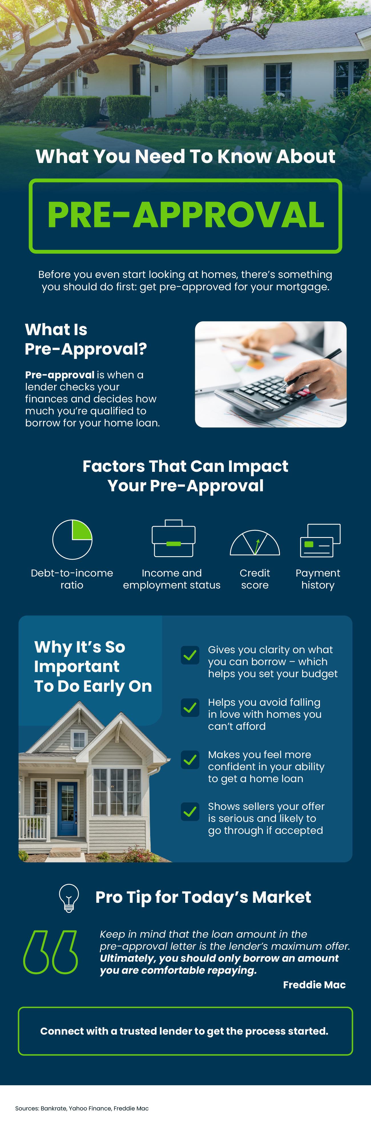 - Pre-approval is when a lender checks your finances and decides how much you’re qualified to borrow for your home loan. This helps you determine your budget and makes your offer stand out for sellers.